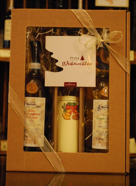 Geschenkpaket mit 2 jungen italienischen Weinen, trockener Weißwein, Orvieto Classico, trockener Rotwein, Montepulciano d'Abruzzo.